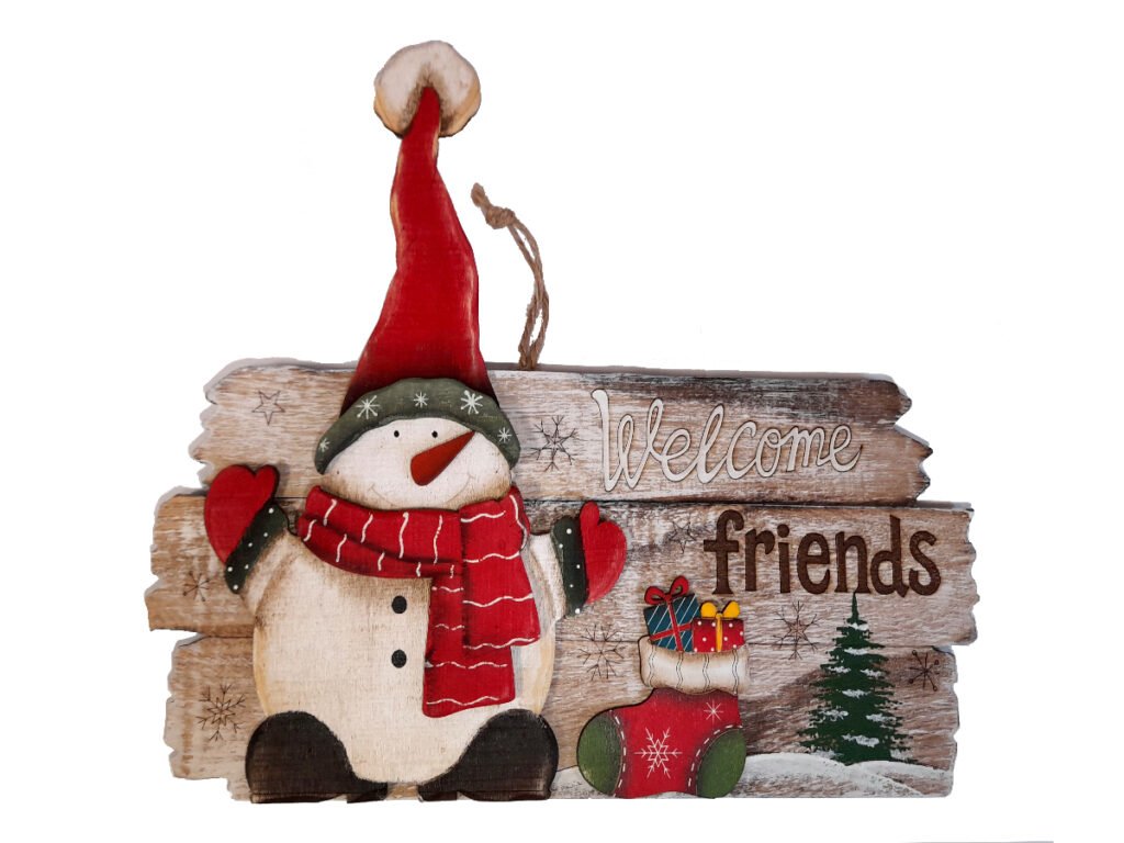Cedule sněhulák s bambulí, dřevo, červená/béžová, 35x29x2cm, ks|Ego dekor