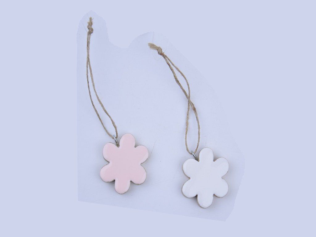 Dekorace květ, závěsná, mangové dřevo+ smalt, růžová/bílá, 5x1x5cm