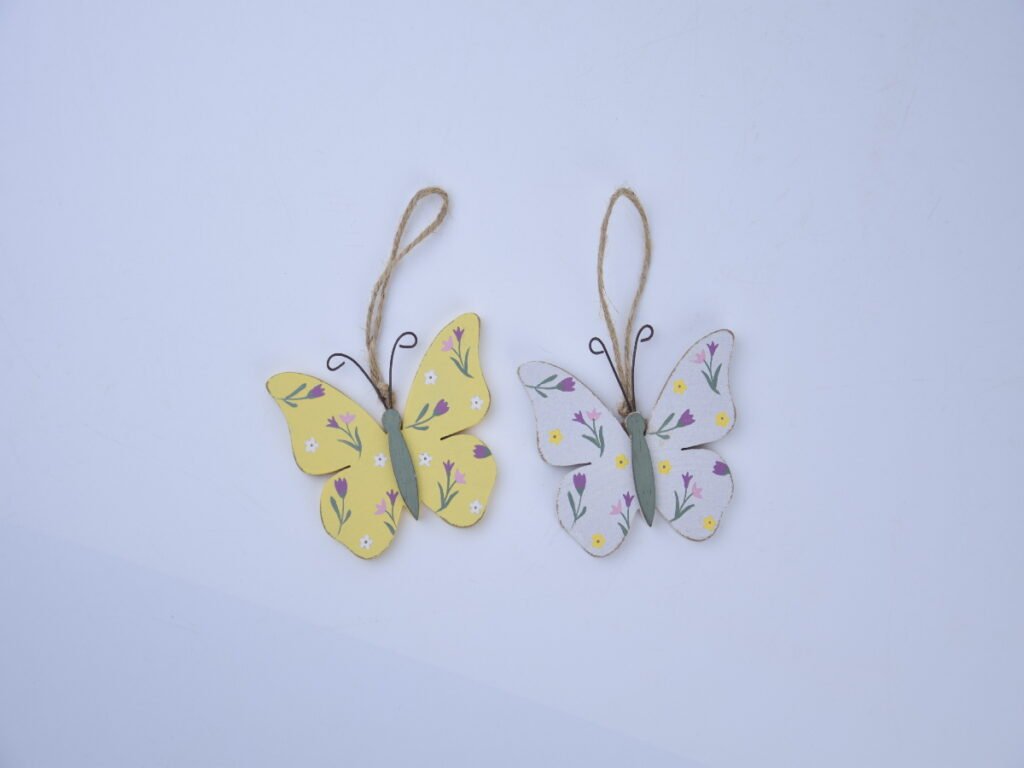 Dekorace motýl, závěsný, dřevo, bílá/žlutá, 9x8,5x0,9cm