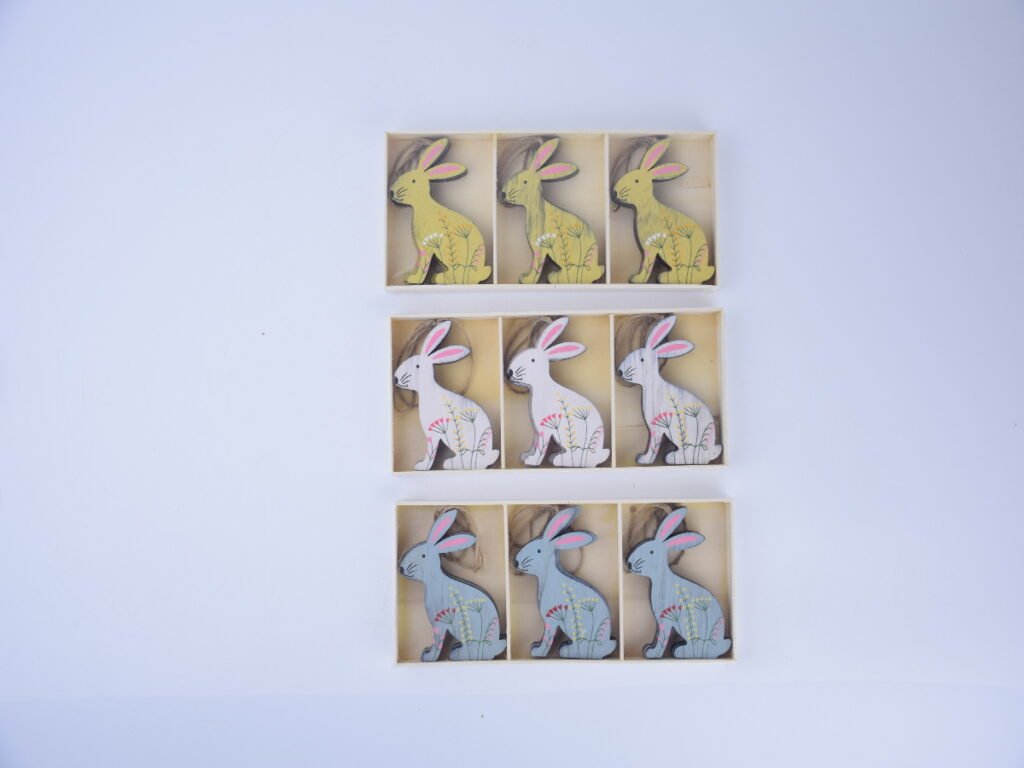 Dekorace zajíc, závěsná, dřevo, bílá/žlutá, 26x10x2cm, box 9ks|3T