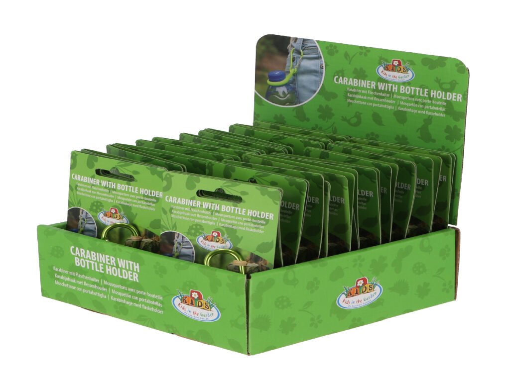 Karabina s držákem na lahev od Esschert Design je chytré a jednoduché řešení, jak mít pití vždy po ruce – ať už na zahradě, při výletě nebo ve škole. Karabina je vyrobena z lehkého kovu a doplněna o pružné gumové očko, které bezpečně uchytí hrdlo běžné PET lahve nebo sportovní lahvičky.