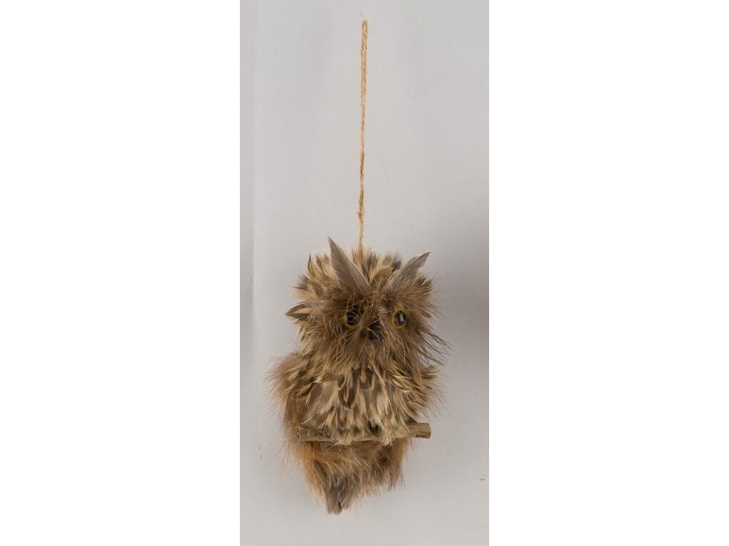 HK VDP Závěs SOVA, sedící, peří/dřevo, hnědá, 8,5x6,5x15cm, ks