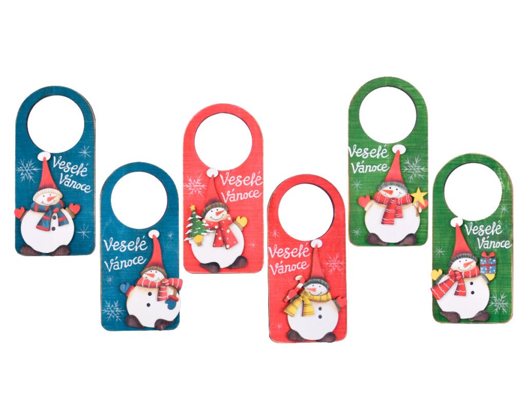 HK VDT Visačka na dveře sněhulák, dřevo, červ./zel./mod., 8x16x1cm, FSC 100%
