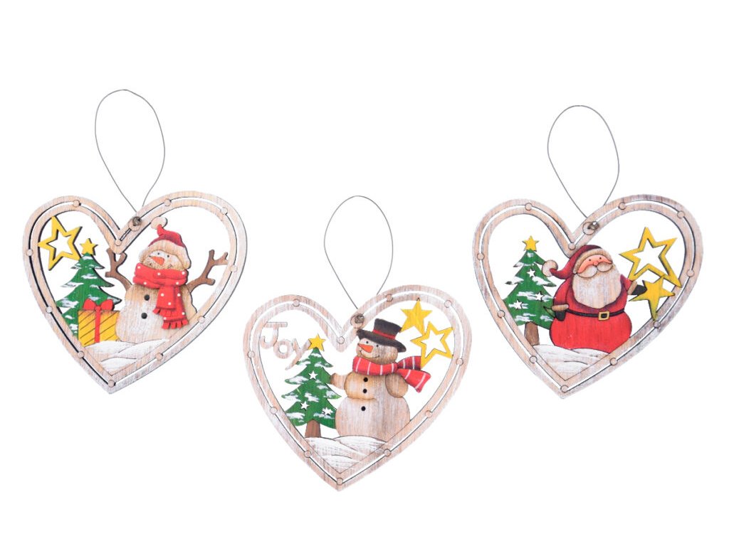 HK VDT Závěs srdce+sněhulák/Santa, dřevo, béž./červ., 13x13x0,5cm, FSC 100%