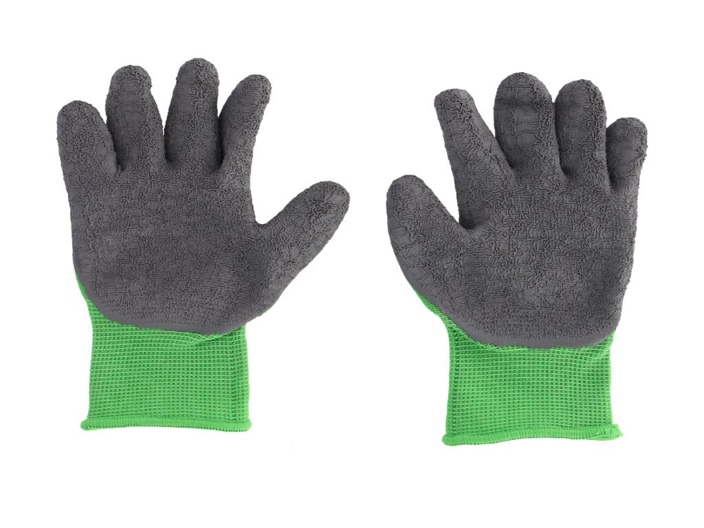 Rukavice jsou vyrobeny z kombinace bavlny a syntetických materiálů, které zajišťují pohodlné nošení, prodyšnost a zároveň chrání ruce před špínou, vlhkostí nebo drobnými poraněními. Elastické manžety drží rukavice pevně na místě a zabraňují vniknutí hlíny nebo trávy dovnitř.