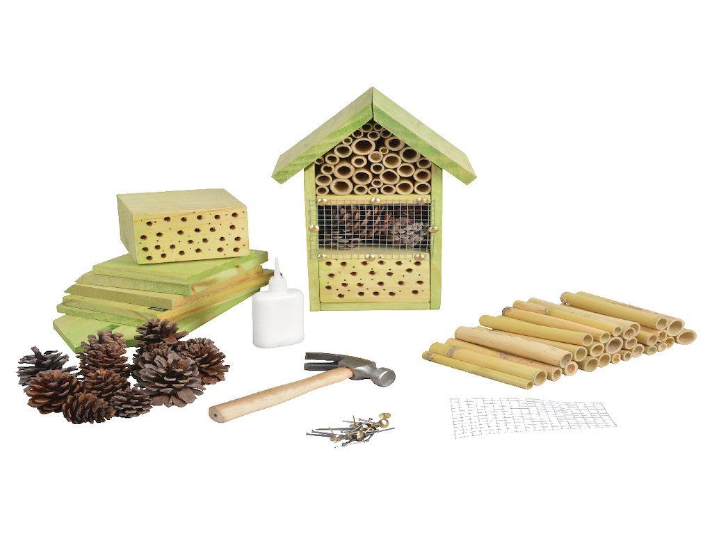 Balíček zahrnuje přesně nařezané dřevěné díly, spojovací materiál a přírodní výplně jako bambusové trubičky, šišky nebo kousky dřeva. Stačí šroubovák a chuť tvořit! Po sestavení lze domeček zavěsit na chráněné místo na zahradě nebo balkonu.