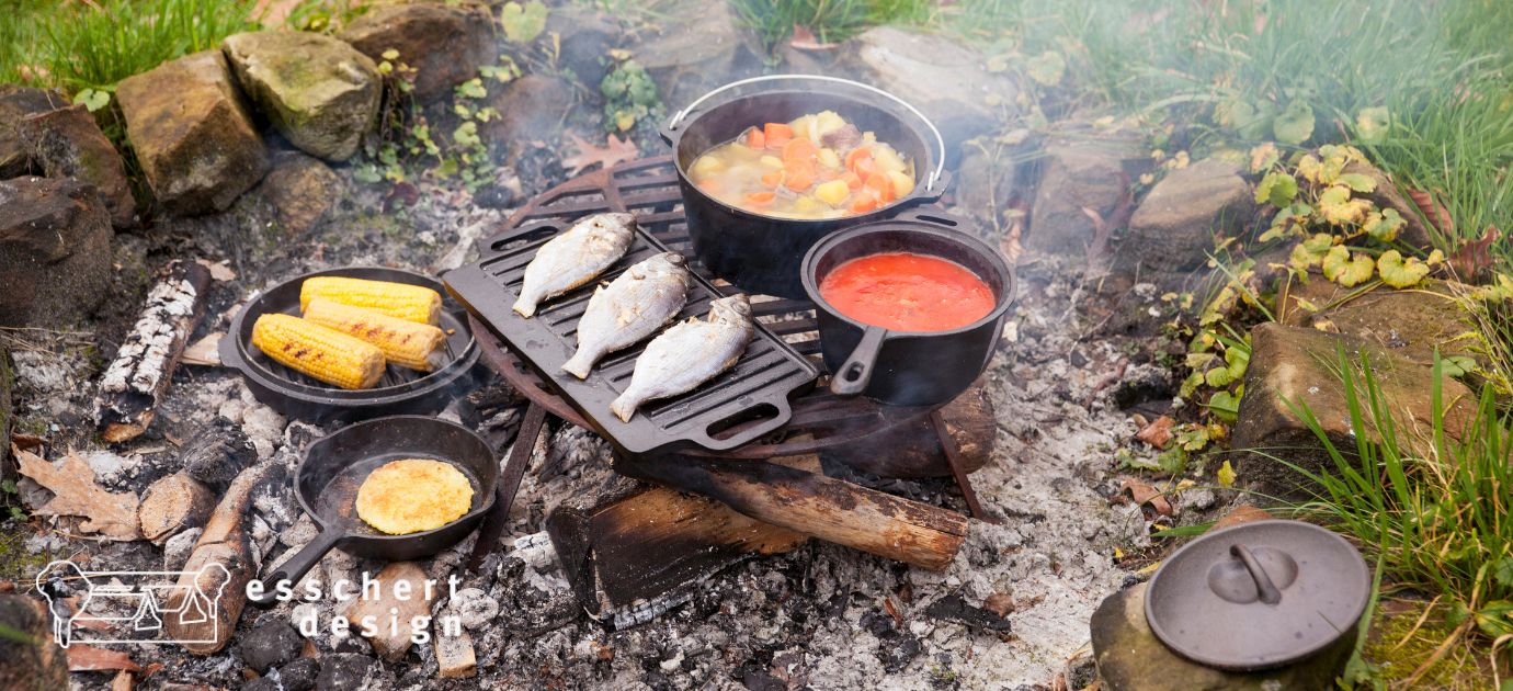 Máme také pánve na oheň, opékací jehly, různé druhy grilovacích roštů, kotlíky, podpalovače a další příslušenství pro milovníky otevřeného ohně.