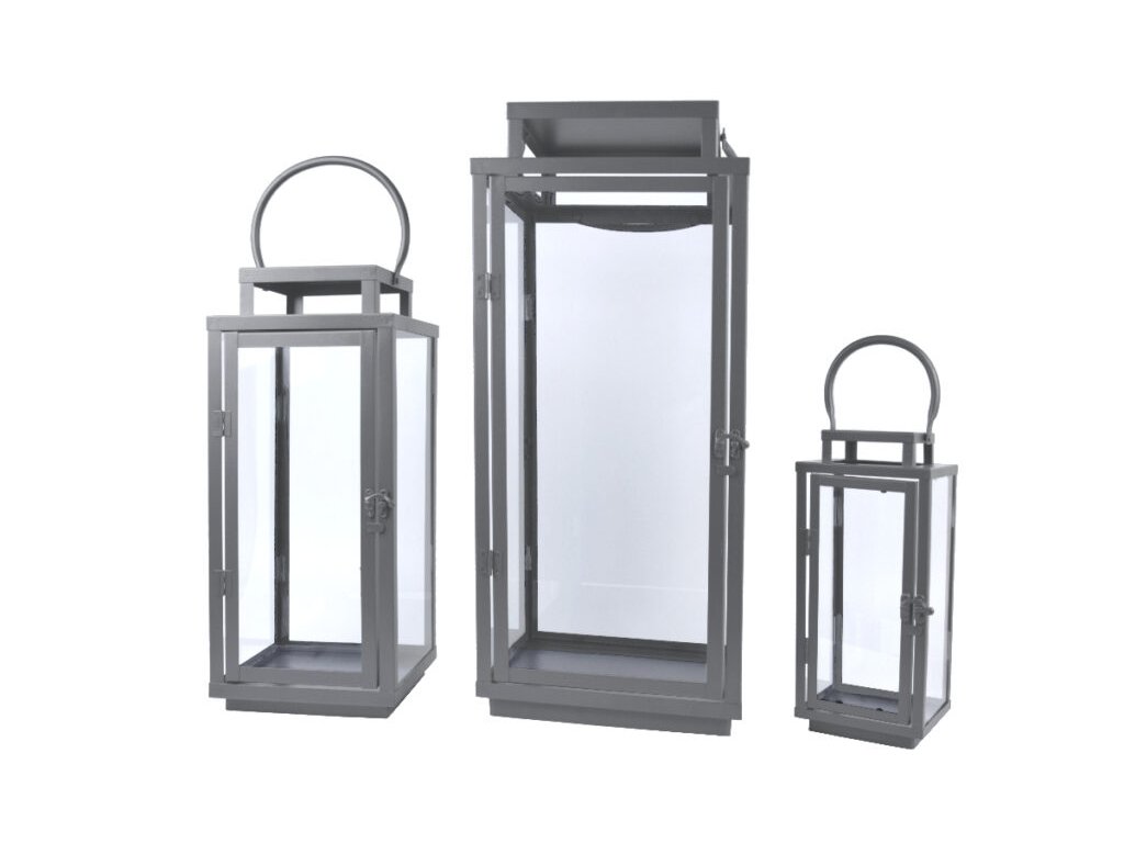 VDT Lucerna hranatá SQUARE, kov/sklo, šedá, 28x61x33/21x46x23/13x32x17cm, Sada 3 ks