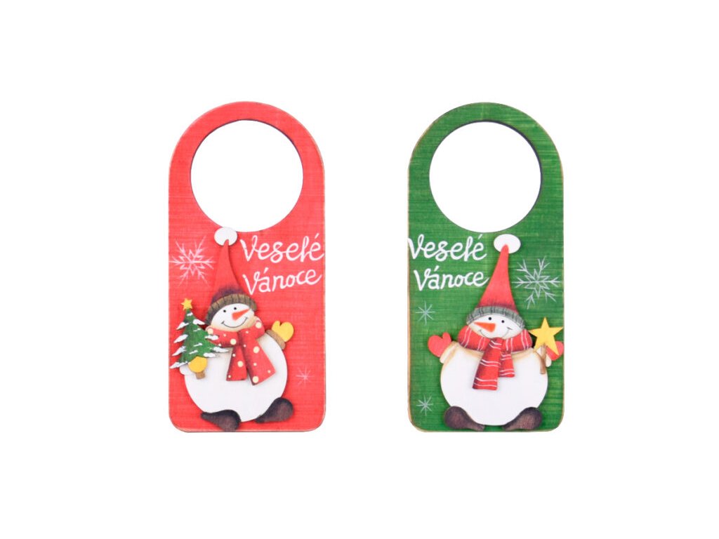 Visačka na dveře sněhulák, dřevo, červ./zel., 8x16x1cm